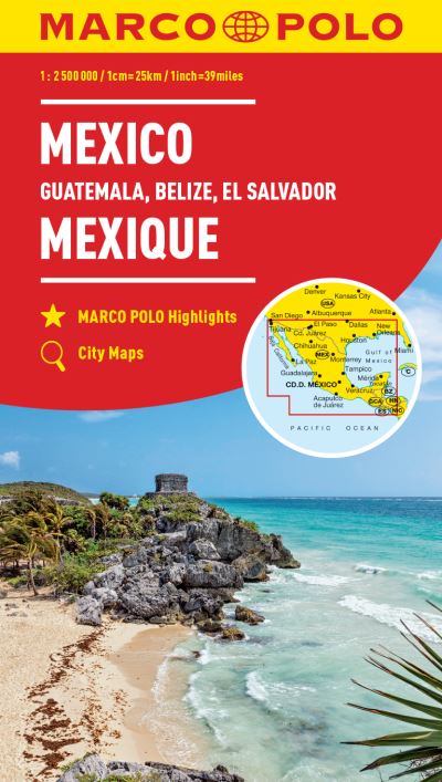 Marco Polo Mexico Map: the ideal map for your trip Let the Marco Polo Mexico Map guide you around this fascinating country. Discover a diverse landscape of mountains, deserts and jungles, ancient ruins, colonial towns and incredible beaches with this highly durable touring map of Mexico. It folds away easily and is always on standby to help when you’re stuck. Perfect touring map – the scale is 1 : 2 500 000* ideal to help you plan your overall route and navigate the main highways by car, RV or campervan. Easy to use – the super clear mapping in strong colours and clear text will help you navigate the region. Includes 5 city maps – detailed street maps of key cities are included as well as coverage of Guatemala, Belize and El Salvador. Mexico highlights – major sights and key points of interest are marked on the map by numbered stars and these are listed in the index booklet with a brief description to help you pick the best places to see en route. Extensive index – the thorough index is fully cross-referenced to the map to help you pinpoint your destination quickly. For the big trips and the little detours, trust Marco Polo’s clear mapping and thorough index to guide you around Mexico.  *(1: 2 500 000 / 1cm=25km / 1inch=39 miles).